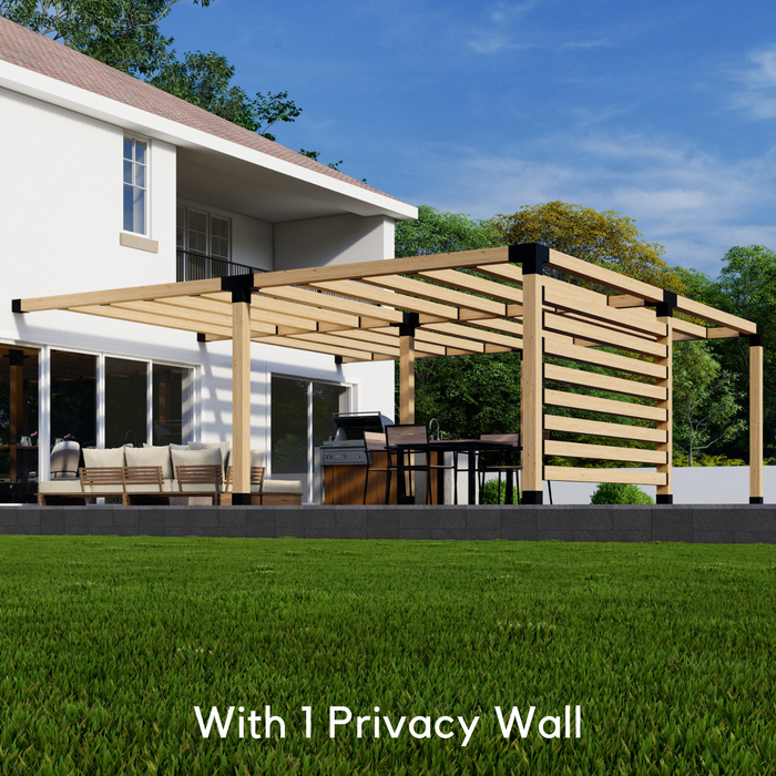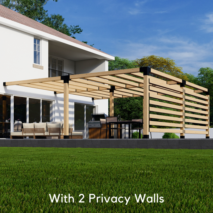This DIY patio pergola kit will accommodate any attached pergola ranging from 13-24 feet wide by 13-24 feet deep. The patio shade pergola does not need to be exactly 24' x 24' like in the images on this page.