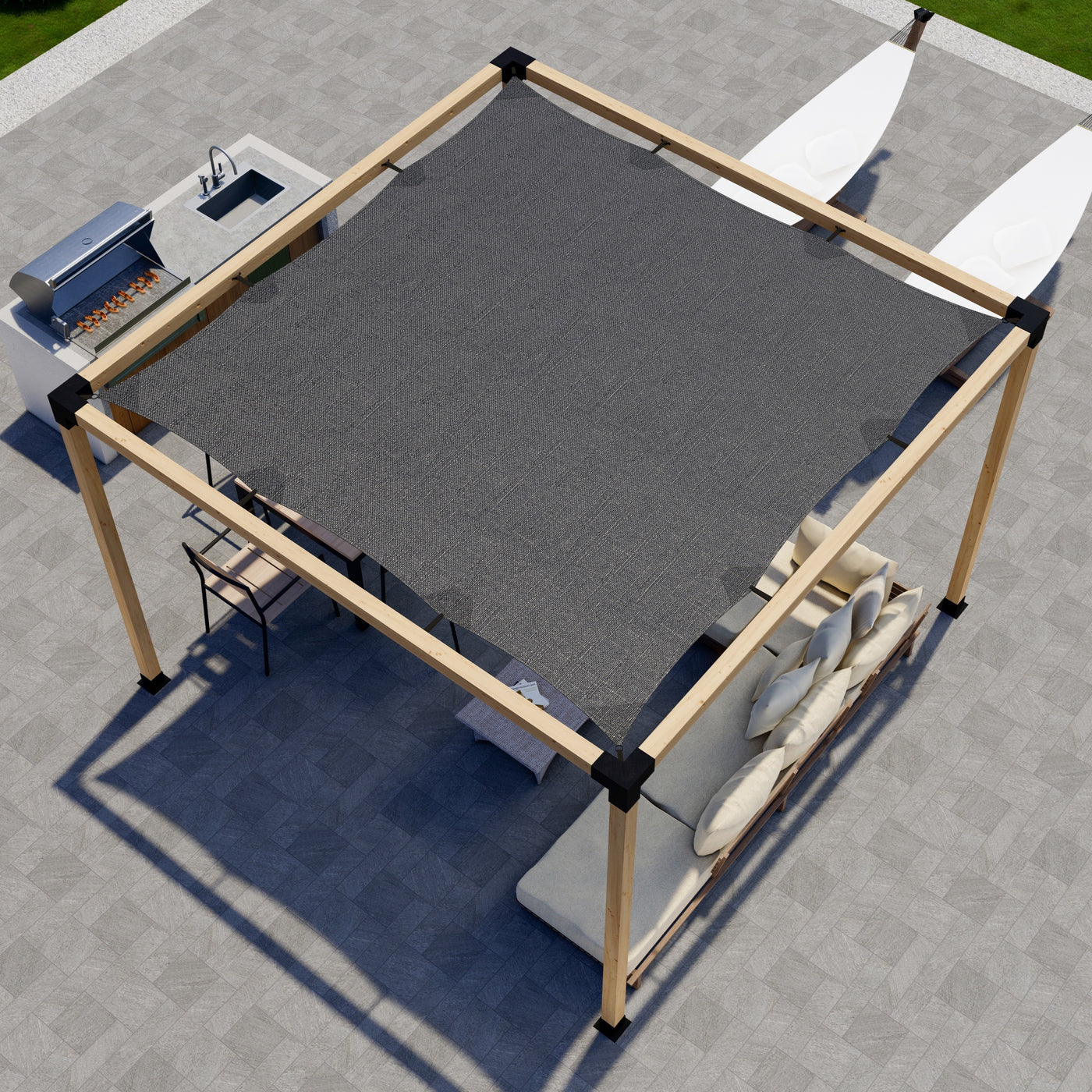 The kit includes a shade canopy in your choice of 6 different sizes: 8x8, 8x10, 8x12, 10x10, 10x12 or 12x12. The shade canopy is made of fade-resistant 180 GSM High-Density Polyethylene (HDPE) knitted fabric that blocks up to 95% of UV rays and is permeable to prevent rain from pooling on top. Each side of the canopy has 4 straps to keep the canopy tight and prevent drooping. The kit also includes all necessary corner and side accessory mounts (including screws) to secure the canopy straps to the beams of the pergola.