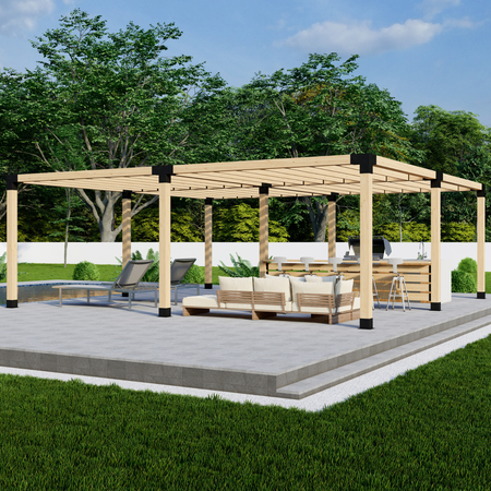 Please note that the materials list above only shows the lumber needed for the outer frame of the pergola (i.e. the 9 vertical posts and the roof beams). If you plan to add a slatted roof and/or one or more privacy walls (see these wall kits for 4x4-frame pergolas or these wall kits for 6x6-frame pergolas), you'll need to purchase additional lumber (likely either 2x4s or 2x6s).