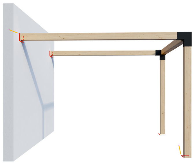 With the assistance of a couple/few helpers (and using ladders as necessary), lift the two roof beams and set the pergola frame against the wall to which you'll be attaching the beams. Use a pen or pencil to lightly trace the left, bottom and right edges of the horizontal beams where they touch the wall to which you will be attaching the pergola.